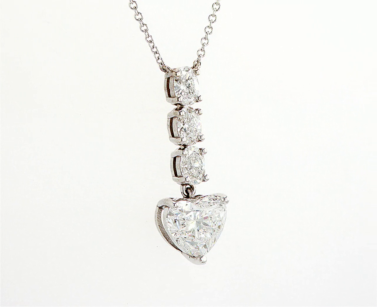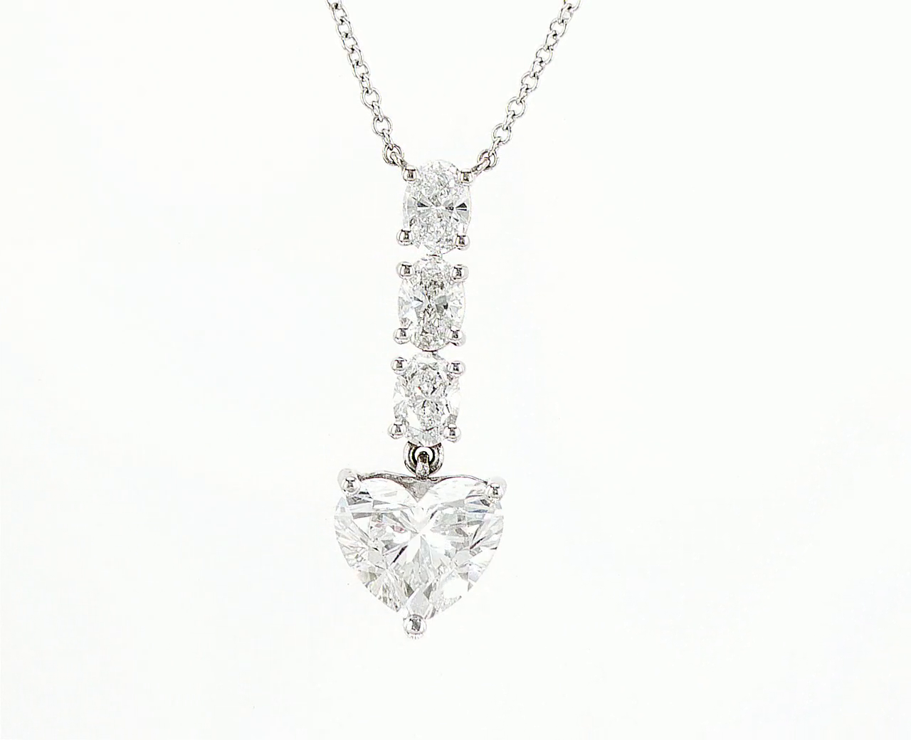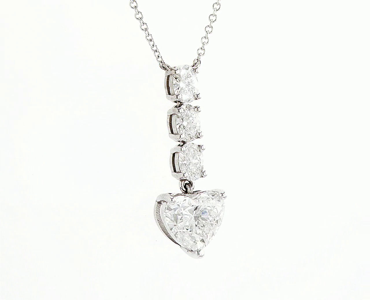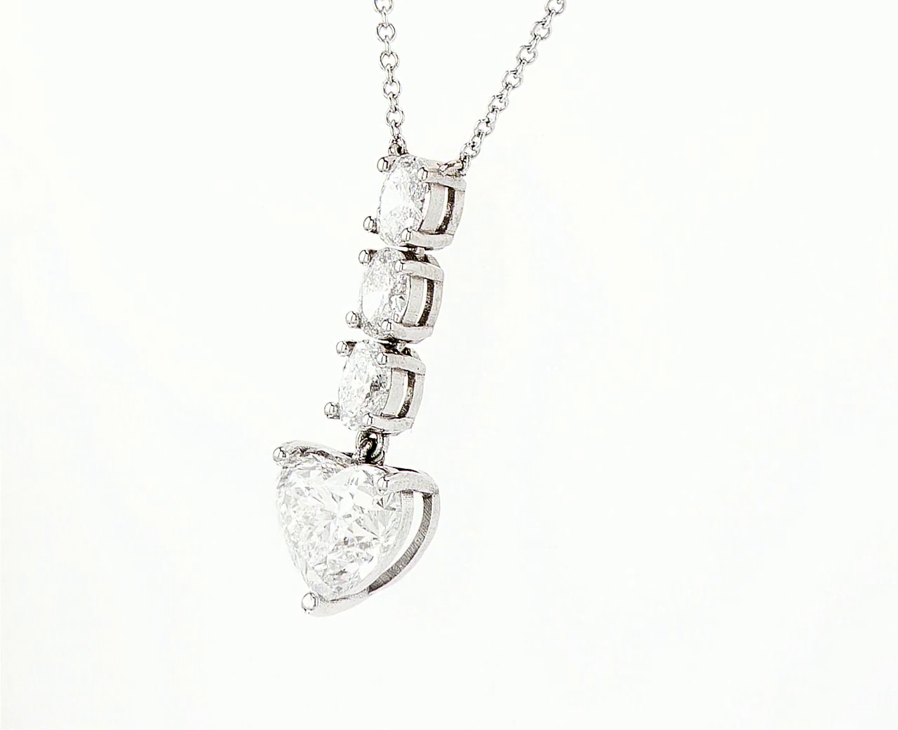 Elegant pendant featuring a heart-shaped diamond with three round diamonds above, set in white gold. A timeless design that radiates brilliance and romance.